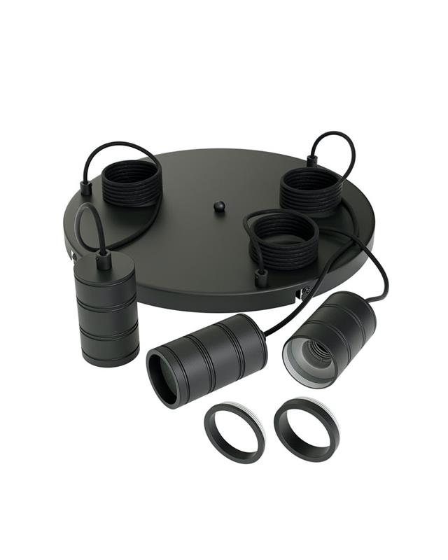 Lámpara de techo con base metálica circular de 40cm de diámetro en color negro con 3 colgantes de 2m de longitud.
