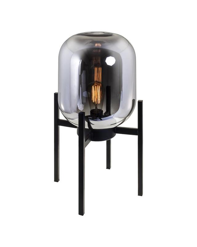 Lámpara de sobremesa decorativa compuesta por un pie metálico en color negro con tulipa de cristal en acabado ahumado.