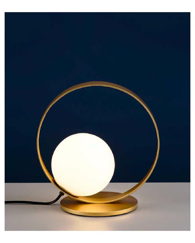 Lámpara de mesa decorativo fabricado en metal en acabado oro técnico con difusor de cristal opal blanco.