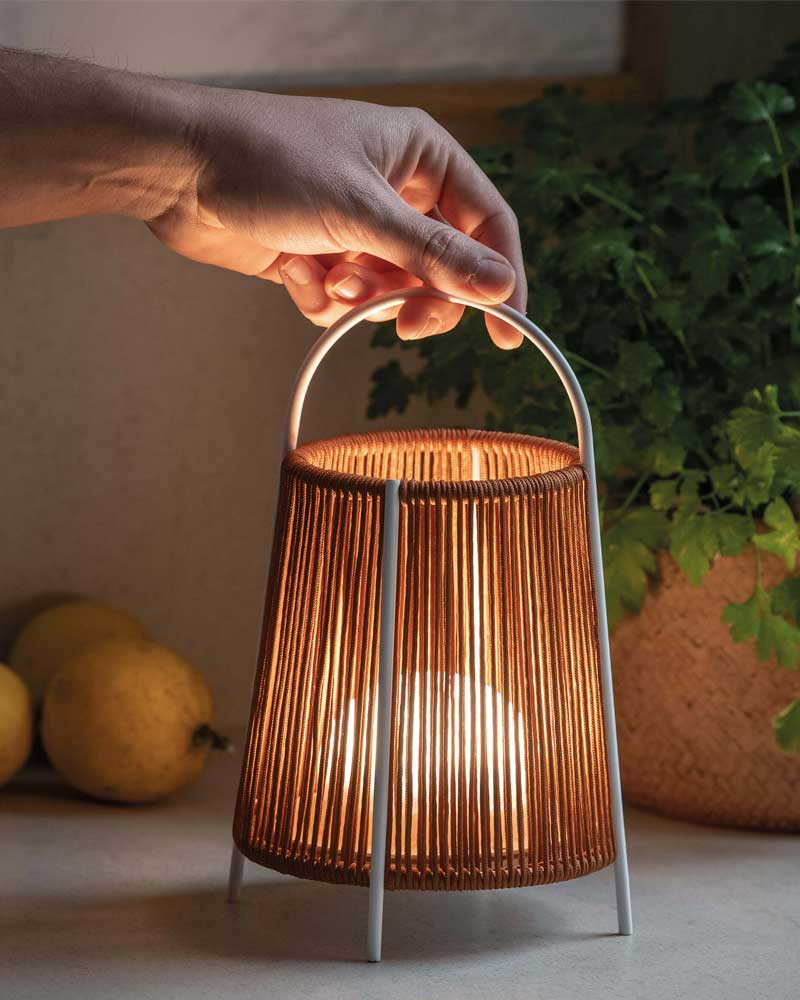 Lámpara de mesa portátil fabricada en metal con cuerda trenzada a mano disponible en 5 colores con protección IP65.