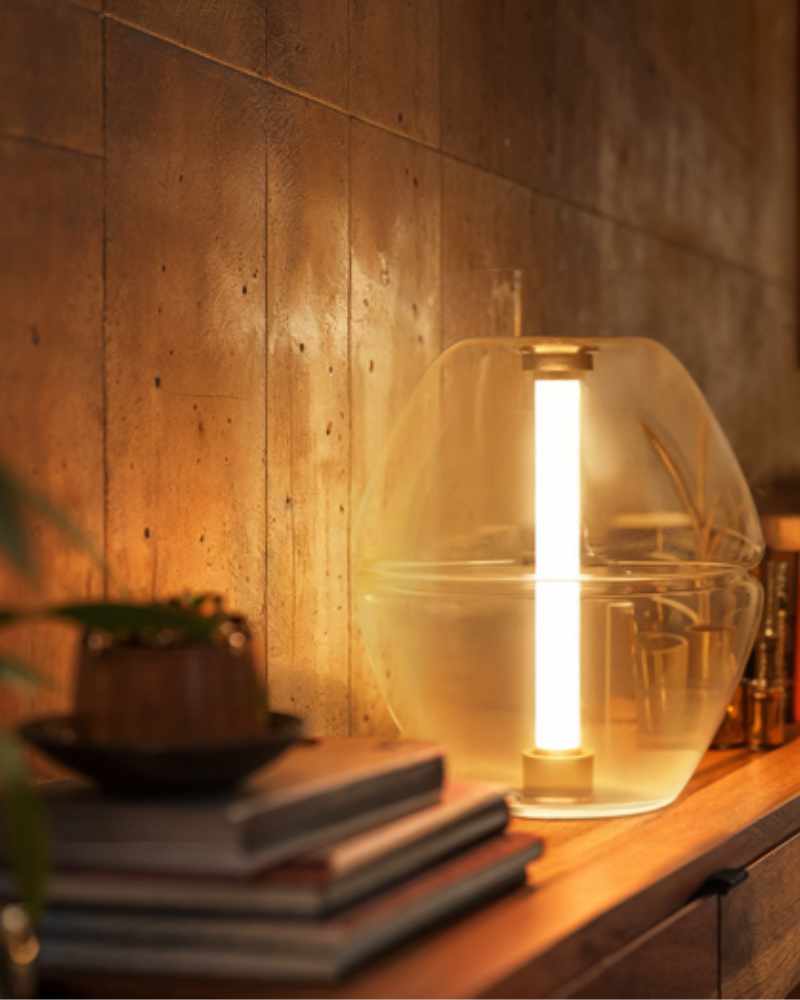 Lámpara de mesa con difusor de cristal transparente y led integrado regulable en intensidad.