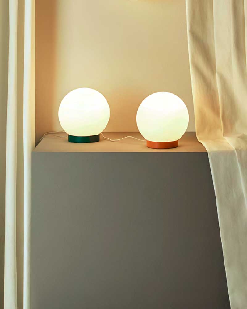 Lámpara de mesa compuesta de una base de metal en diferentes colores a elegir con tulipa de cristal opal en diferentes tamaños.