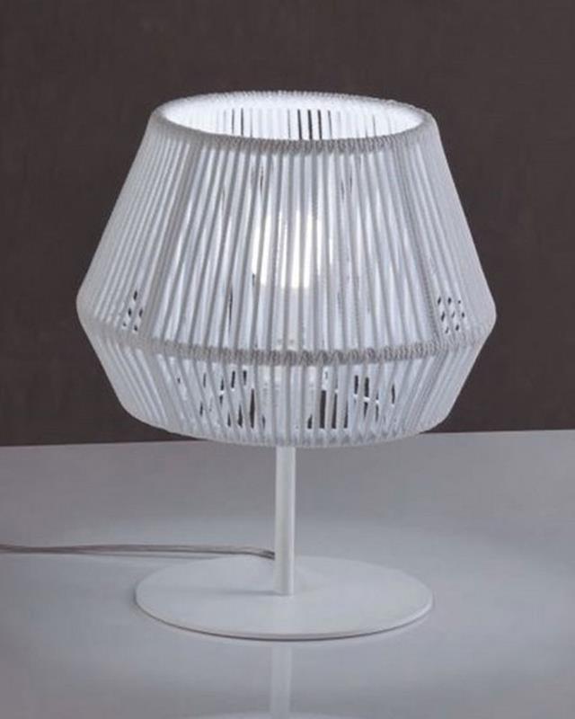 Lámpara de mesa compuesta por una estructura metálica en color blanco con una tulipa de cordón trenzado a mano disponible en infinidad de acabados.