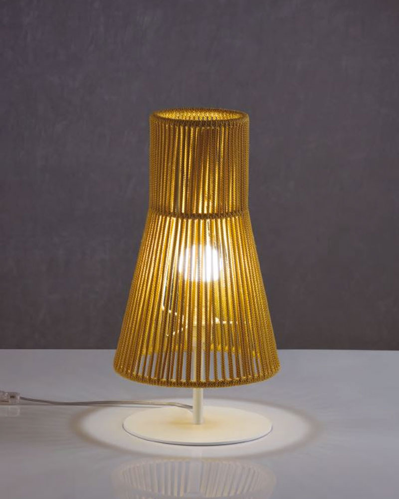 Lámpara de mesa compuesta por una estructura metálica en color blanco con una tulipa de cordón trenzado a mano disponible en infinidad de acabados.