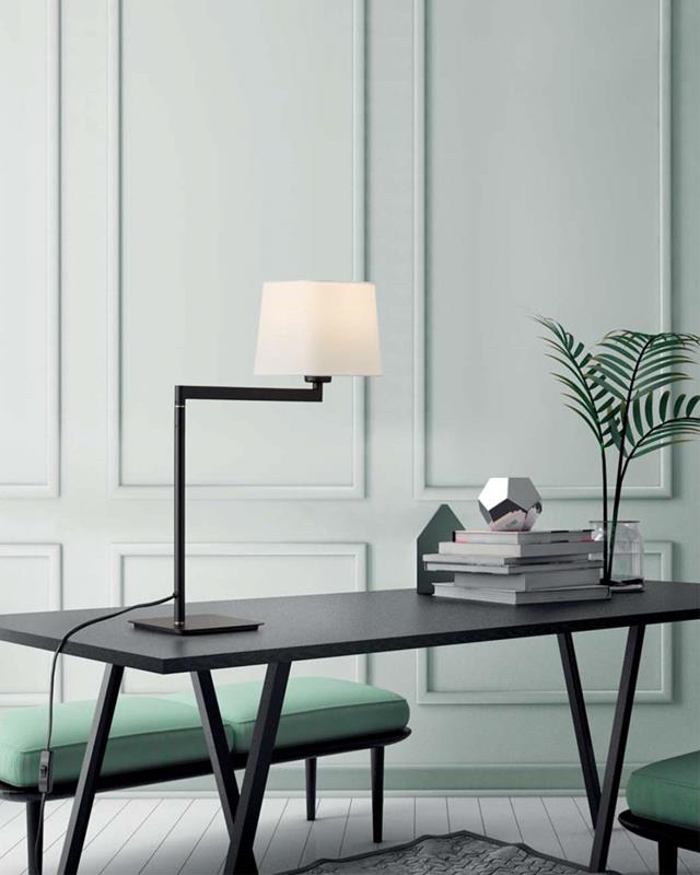 Lámpara de mesa metálica con pantalla de tela en color blanco y brazo orientable.