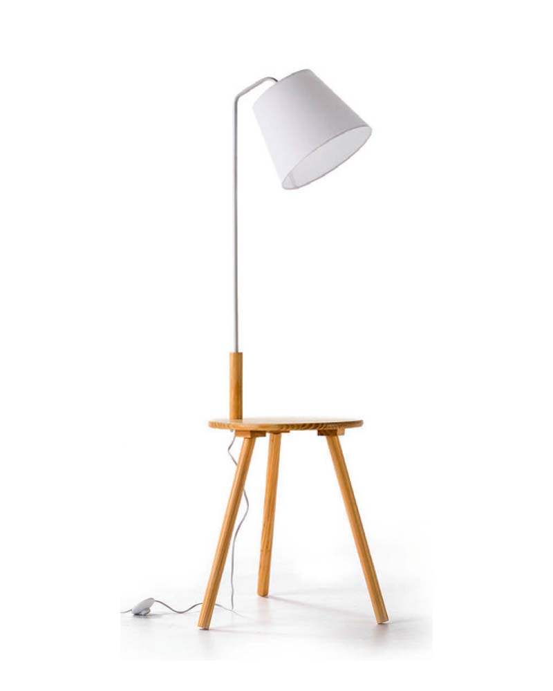 Lámpara de pie decorativa y multifunción fabricada en madera natural, metal blanco y pantalla de tela blanca.
