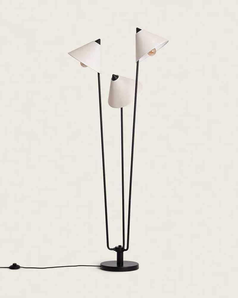 Lámpara de pie fabricada en metal en color negro con 3 tulipas de tela a diferentes alturas.
