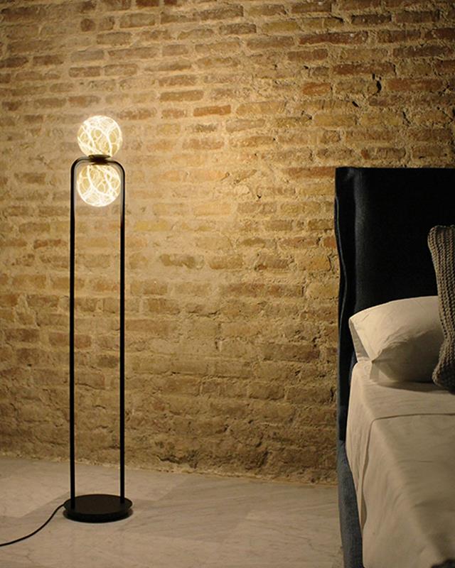 Lámpara de pie fabricada con estructura en acabado color negro mate con 1 o 2 difusores de alabastro en acabado natural según versión.