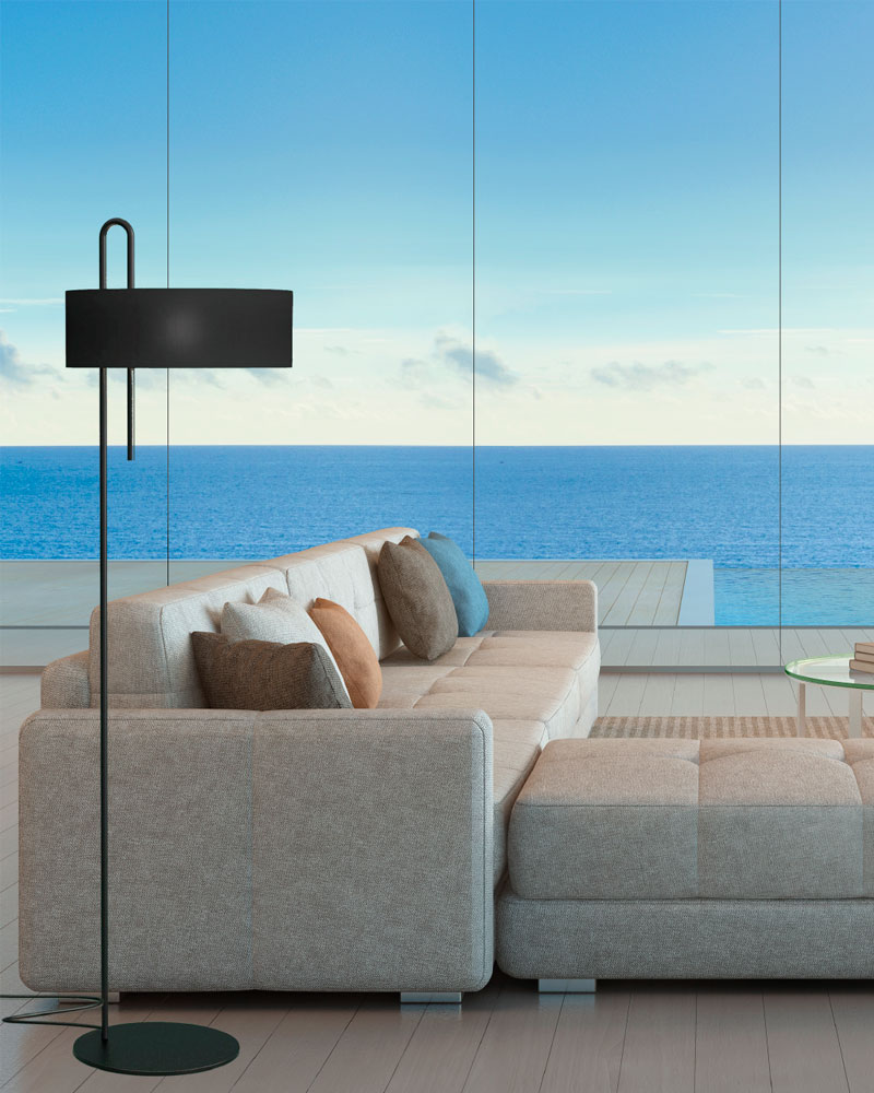 Lámpara de pie de diseño estilizado con pantalla de tela de algodón en color negro.