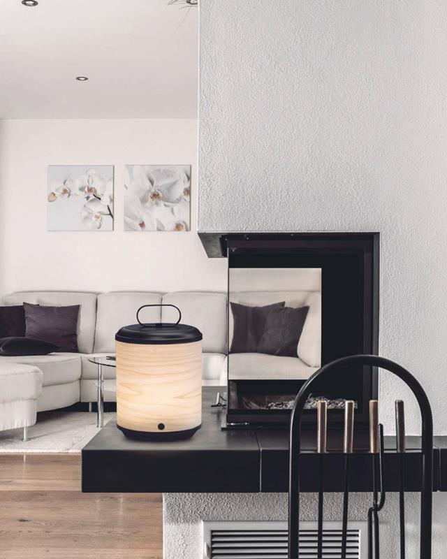 Lámpara de mesa o suelo portátil con batería recargable fabricada en metal en color negro y chapa de madera natural disponible en 8 colores diferentes.
