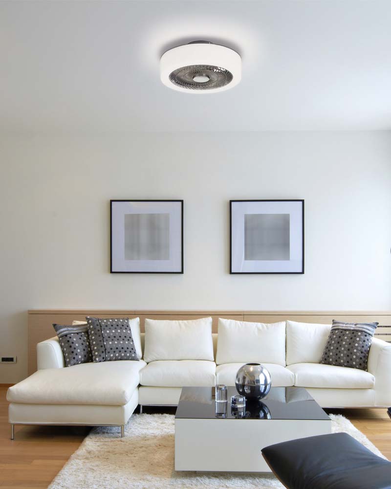 Ventilador de techo tipo plafón de forma compacta y con iluminación LED integrada.
